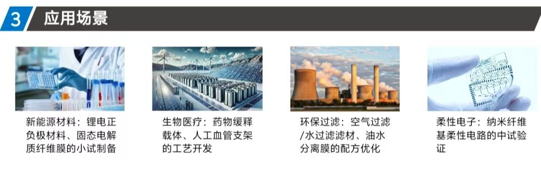 •模块化升降平台:四联动蜗轮蜗杆结构,定位精度±0.03mm,适配不同厚度基材、不同纺丝距离的调控。 智能化与安全性