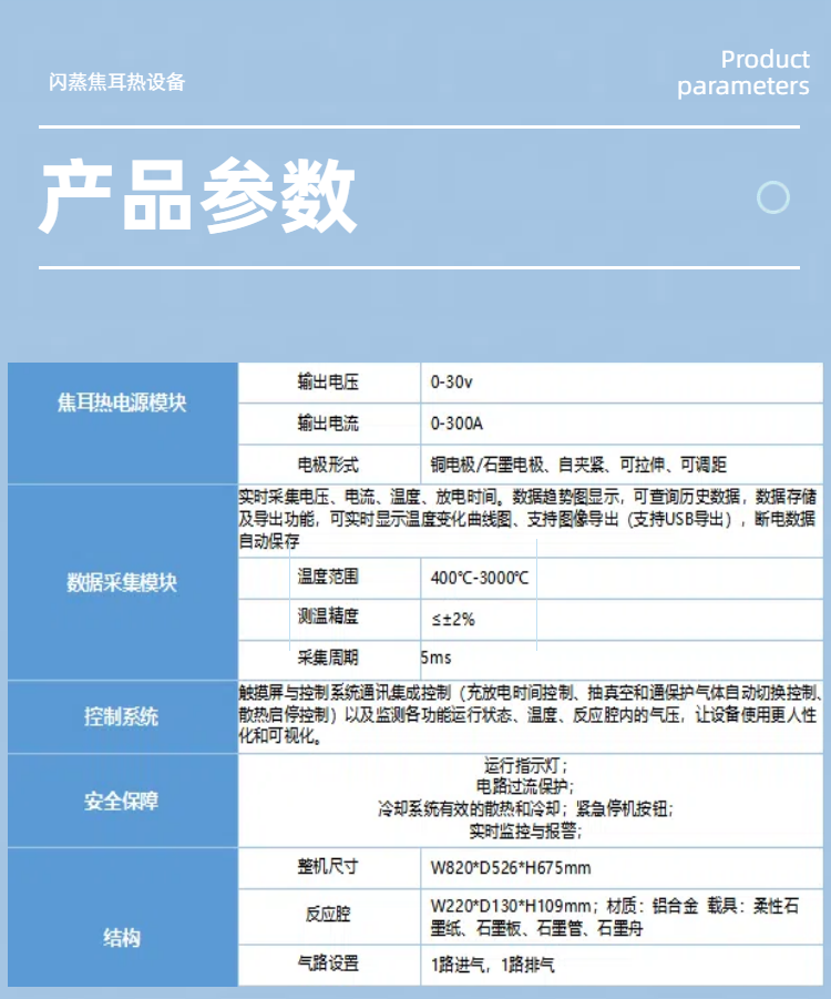 快速加热:1s加热到3000°C;3000℃内精确控制加热温度;可加热各种粉末、薄膜、块体;环境友好:低能耗、不需溶剂或者反应气体;升降温速度快(105⁓ 106 K/s);数据采集精度高;可定制持续放电0-500s。