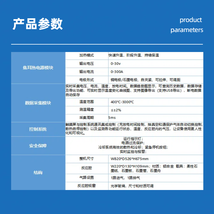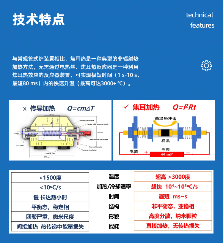 快速加热:1s加热到3000°C;3000℃内精确控制加热温度;可加热各种粉末、薄膜、块体;环境友好:低能耗、不需溶剂或者反应气体;升降温速度快(105⁓ 106 K/s);数据采集精度高;可定制持续放电0-500s。